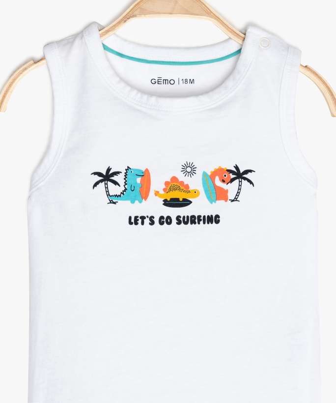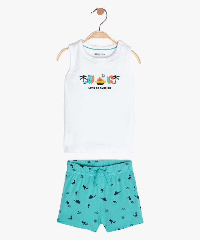 Ensemble bébé garçon en jersey de coton souple, aux coloris gourmands et à l'imprimé estival, en version print all over ou motif unique sur la poitrine. Le lot comprend un débardeur et un short. Tout est fait pour faciliter l'enfilage : la taille élastiquée ainsi que le bouton-pression à l'épaule. Un ensemble de 2 pièces à porter ensemble ou séparément, à glisser dans la valises des vacances pour un look fun en un clin d'œil. Short avec cordon d'ajustement à la taille. Débardeur avec finition biais assorti au col et aux emmanchures. Ourlet surpiqué.