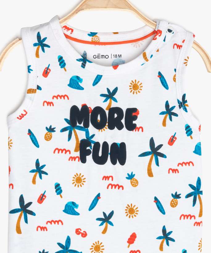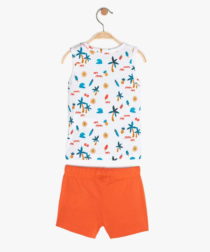 Ensemble bébé garçon en jersey de coton souple, aux coloris gourmands et à l'imprimé estival, en version print all over ou motif unique sur la poitrine. Le lot comprend un débardeur et un short. Tout est fait pour faciliter l'enfilage : la taille élastiquée ainsi que le bouton-pression à l'épaule. Un ensemble de 2 pièces à porter ensemble ou séparément, à glisser dans la valises des vacances pour un look fun en un clin d'œil. Short avec cordon d'ajustement à la taille. Débardeur avec finition biais assorti au col et aux emmanchures. Ourlet surpiqué.