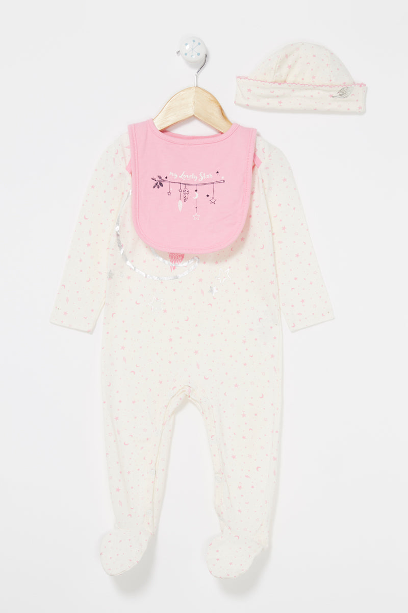 Ensemble 3 pièces écru et rose. Grenouillère, bavoir et bonnet