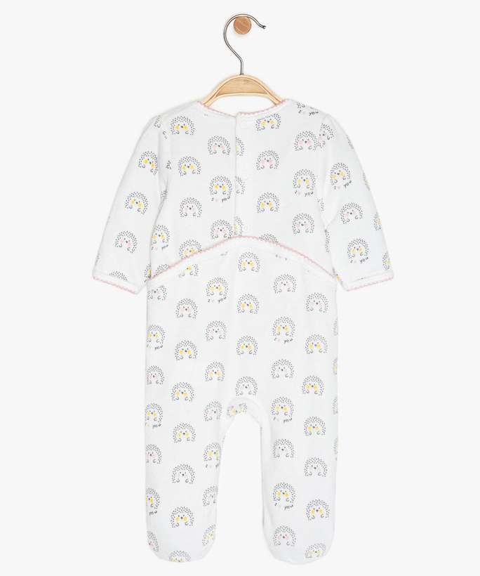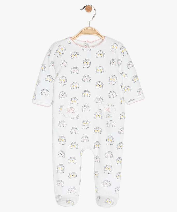 Votre petite fille sera à croquer avec ce joli pyjama à l'imprimé hérissons all over. On est sous le charme des finitions soignées et girly de cette grenouillère : fausses poches devant avec petit nœud satiné, finition brodé en contraste aux poignets, à l'encolure et au niveau du pont-dos. Confection en velours chaud et doux.