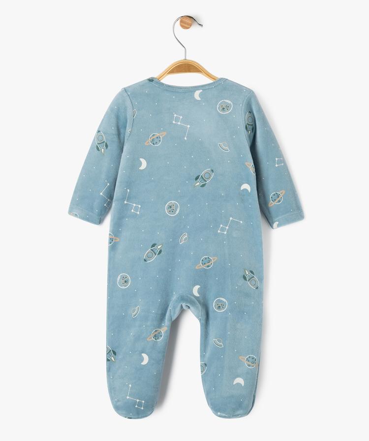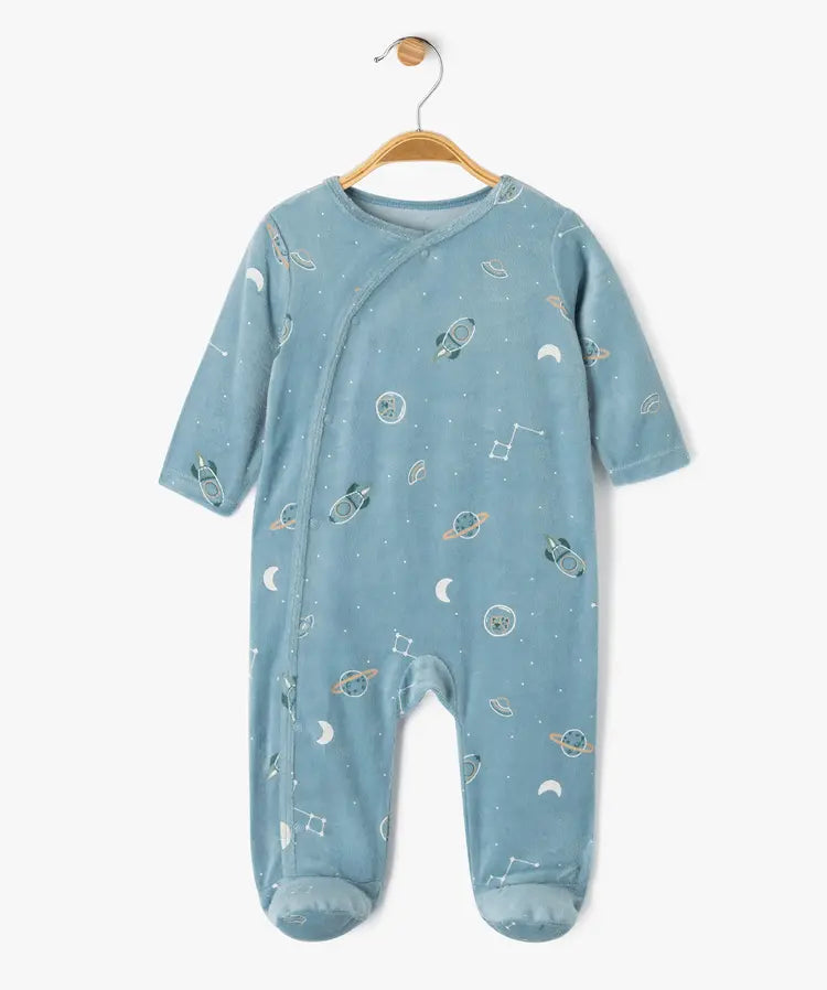 Ce pyjama dors-bien pour bébé garçon, en velours doux, est conçu pour le confort des tout-petits. Avec son ouverture devant par boutons-pression, il facilite l'habillage et le change sans trop de manipulation. Idéal pour les nouveaux-nés ! Le pyjama est orné de motifs cosmiques fantaisie. Pratique et élégant, le pyjama assure une douceur et une chaleur idéales pour votre bébé.