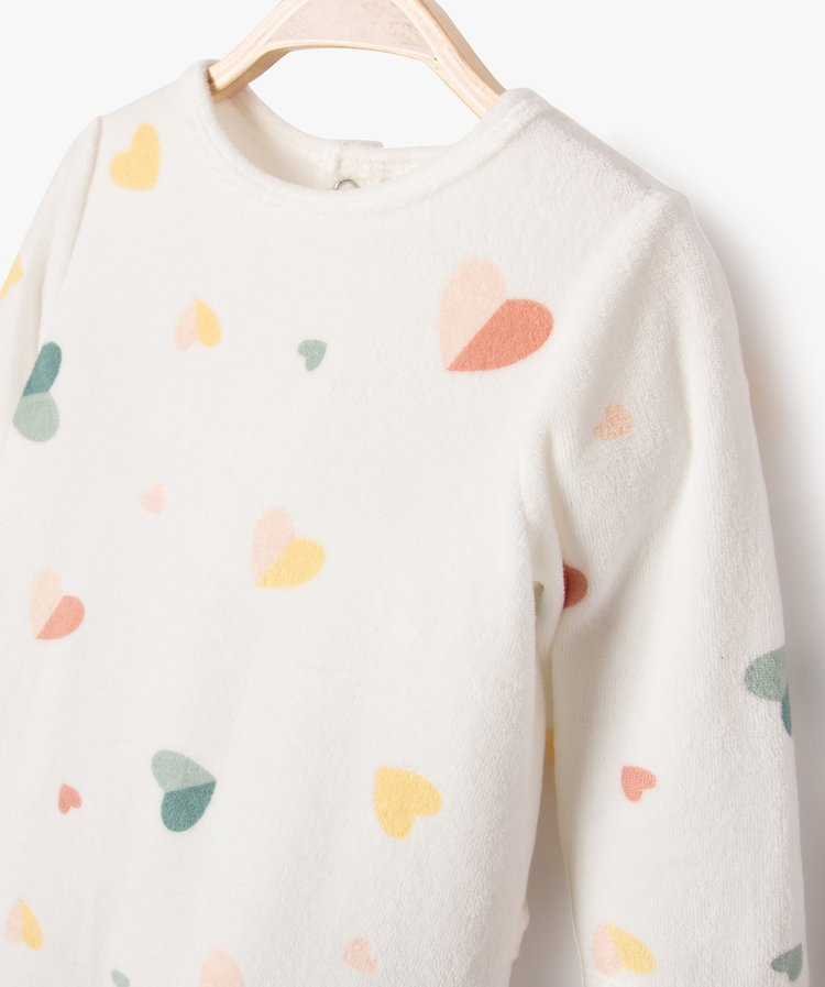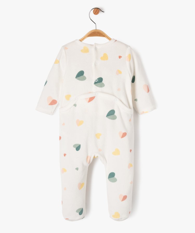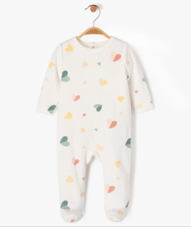Adorable pyjama bébé réalisé dans un velours chaud et parsemé de cœurs multicolores. Un pyjama à croquer, pour des nuits douces et douillettes, au top du confort. Le pyjama dors-bien est idéal pour les tout-petits, avec sa fermeture pont-dos pressionné. Il offre un habillage et un change faciles. Finition biais au col et aux poignets.