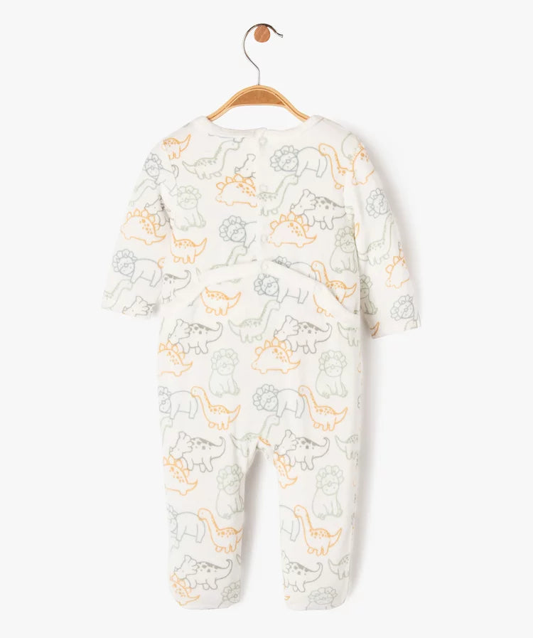 Ce pyjama bébé garçon est une combinaison parfaite de style et de confort. Fabriqué en velours doux, il garantit des nuits paisibles pour votre petit trésor. Les tons délicats et les adorables motifs dinosaures ajoutent une touche de charme supplémentaire. Sa fermeture pont-dos à boutons-pression simplifie l'habillage et le change de bébé. Un pyjama dors-bien à la fois pratique et élégant pour les douces nuits de votre bout de chou. Col rond finitions biais.