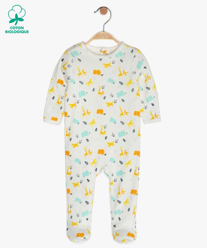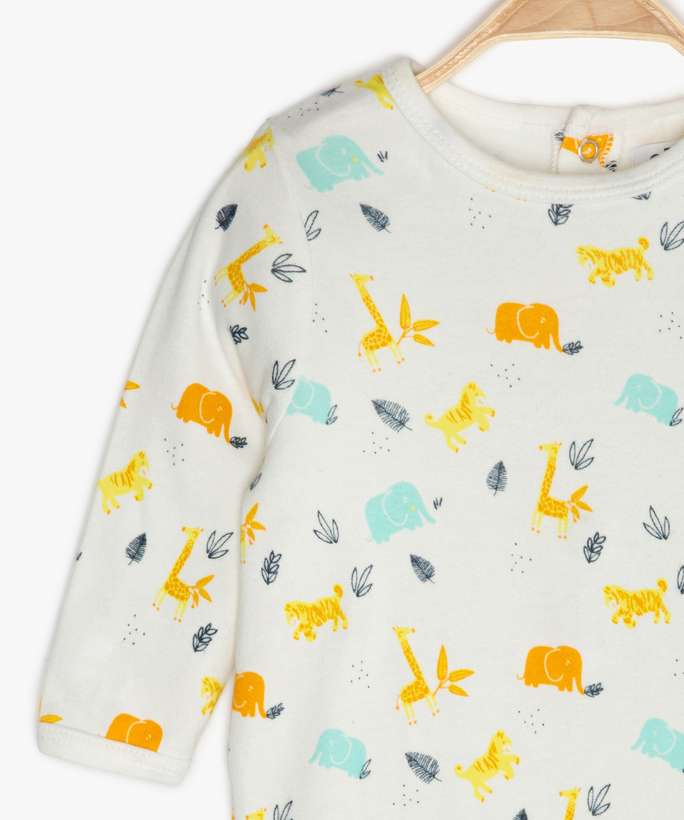 Adorable pyjama en jersey 100% coton biologique léger, idéal dans les régions tempérées et pour les beaux jours. On craque complètement pour l'originalité de son motif avec animaux de la jungle et feuillage tout en couleurs. Un pyjama bébé avec pont dos pressionné. Finition biais uni au dos, au col et aux poignets.