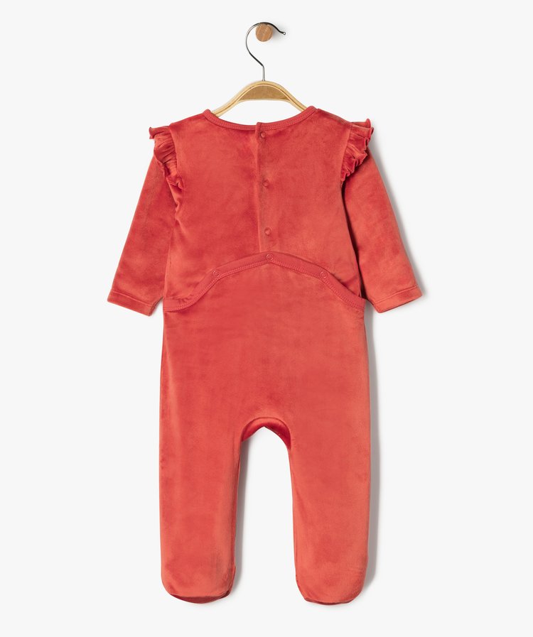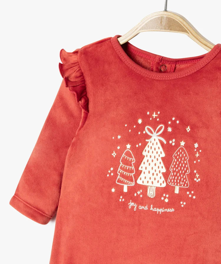 Enveloppez votre bébé de douceur et de magie avec ce pyjama de Noël en velours. Festif, le pyjama bébé est décoré de motifs traditionnels de Noël, avec des sapins ornés de touches dorées brillantes. Le pyjama dors bien, équipé d'un pont dos pressionné, est pratique à enfiler et surtout, il permet de changer bébé sans le déshabiller complètement. Les volants aux épaules apportent une touche élégante. Le velours duveteux, très souple et doux, garantit un confort optimal. Col rond finition biais.