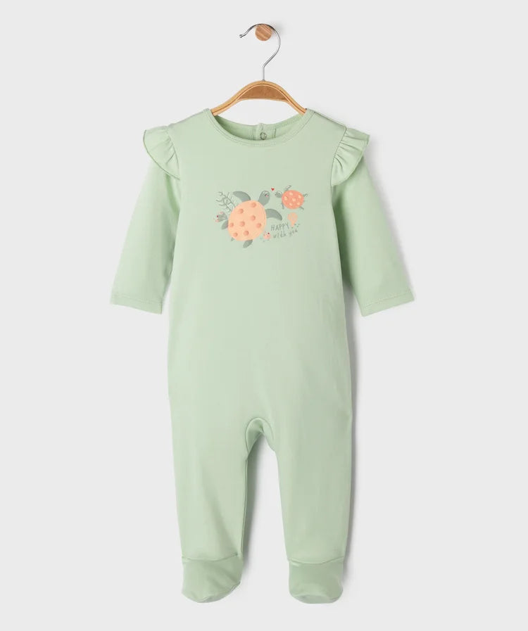 Confort et élégance sont au rendez-vous sur ce joli pyjama bébé fille. Un pyjama en coton léger adapté à la saison estivale, orné d’adorables tortues sur le buste et de petits volants sur les épaules. Ce pyjama girly possède une fermeture pont-dos par boutons pression qui facilite l’habillage et le change. Col rond souligné par un biais.