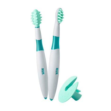 Bâtonnet + brosse aux picots résistants pour masser efficacement l’ensemble de la cavité buccale et brosser en douceur les 1ères dents de lait. • NUK Brosse de massage à picots arrondis : massage efficace des gencives