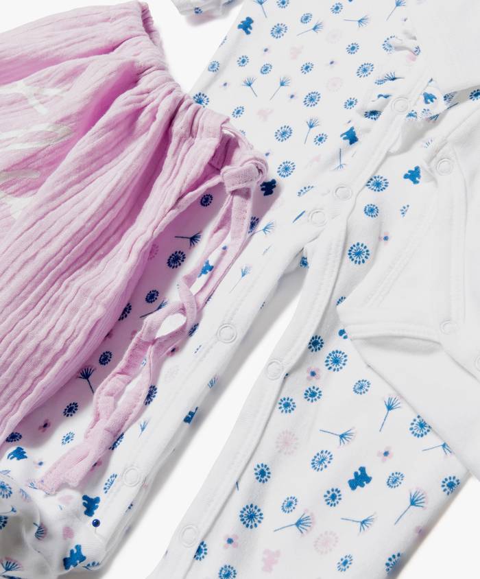 L’ensemble 4 pièces LuluCastagnette est une excellente idée de cadeau de naissance pour les petites filles. Un ensemble craquant décliné dans des teintes pastel et orné de motifs fleuris et pailletés. Cet ensemble bébé fille se compose de :