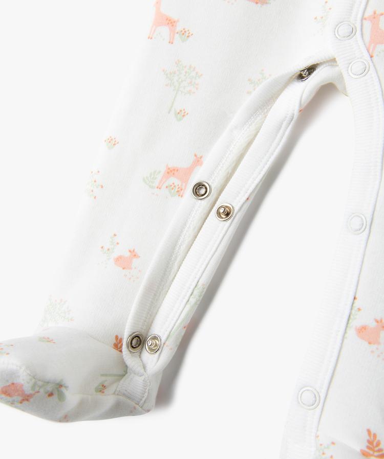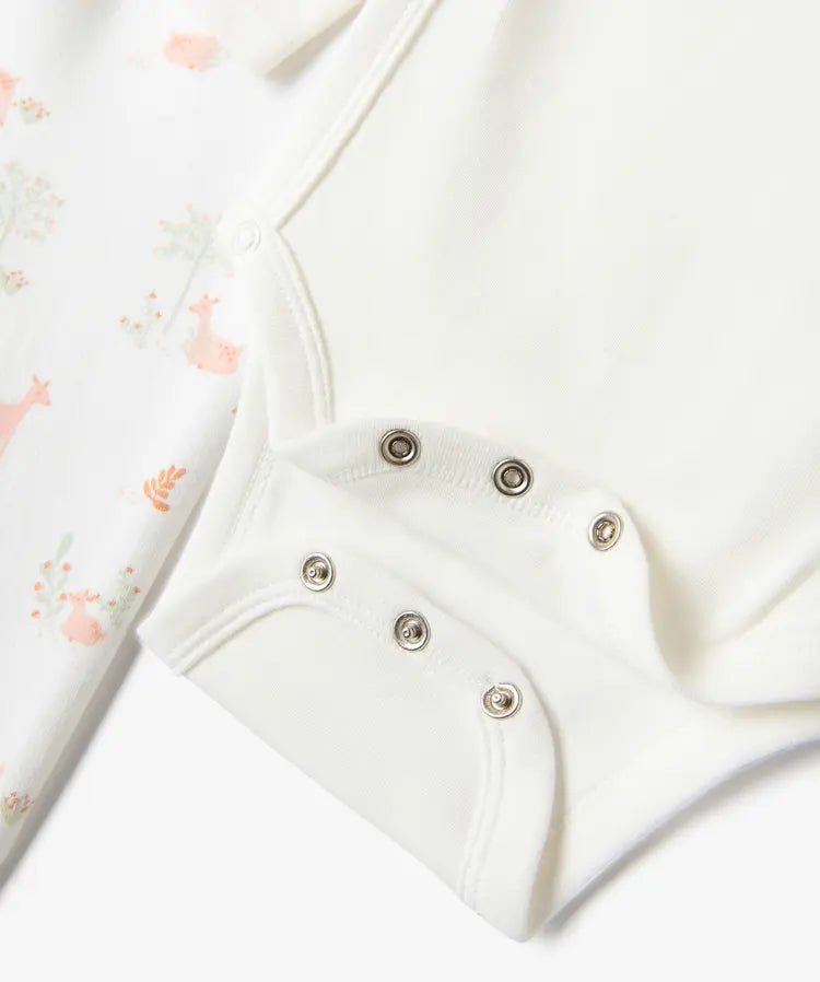 Offrez un cadeau de naissance utile et joli ou équipez-vous facilement pour l'arrivée de votre nouveau-né avec l'ensemble 3 pièces pour bébé. Le pack se compose d'essentiels aux premiers mois de la vie de bébé : un pyjama ouverture devant, un body manches longues ouverture devant et un bavoir. Le tout, décoré dans un adorable motif biches et forêt. Spécialement conçus pour les tout-petit, l'ensemble est entièrement pressionné et donc facile à enfiler.