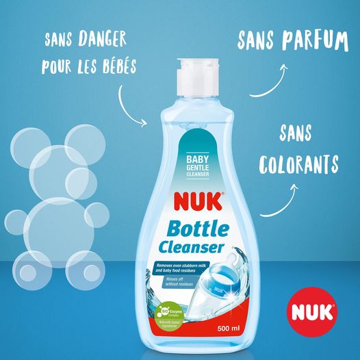 Nuk a conçu ce liquide nettoyant spécifique pour les biberons, les tétines et l’ensemble de la vaisselle servant à l’alimentation des bébés.