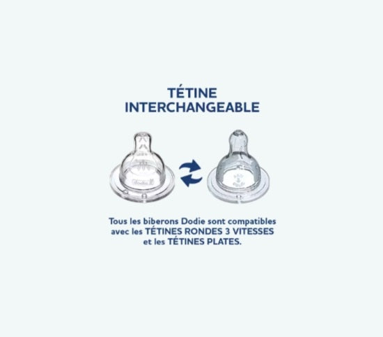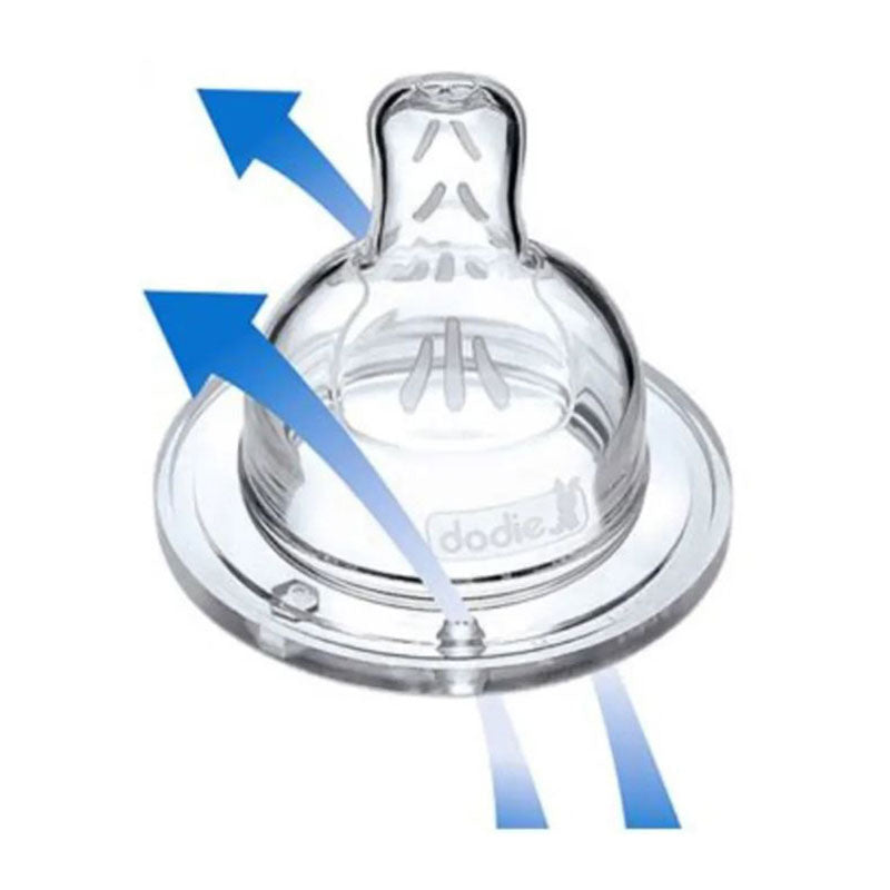 Le système anti-colique est intégré à la tétine grâce à une valve brevetée, qui favorise la circulation de l'air et réduit les risques de coliques, d'aérophagie et de régurgitations. Les tétines Sensation+ s'adaptent sur tous les biberons Dodie col large (gammes Sensation+ et Initiation+)