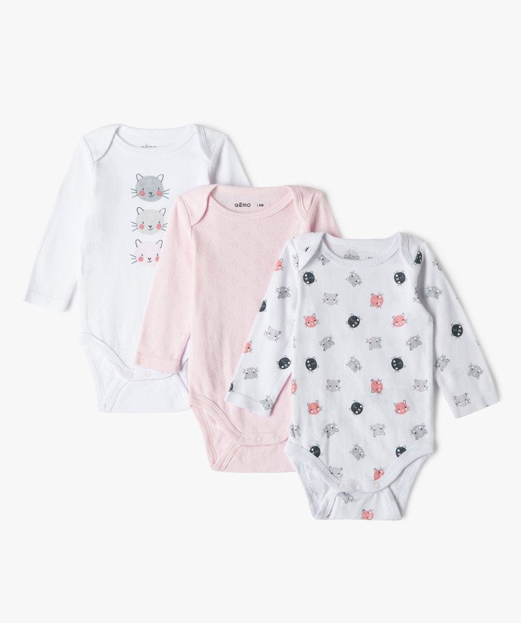 Lot de 3 bodys ML, blanc et rose à motifs chats