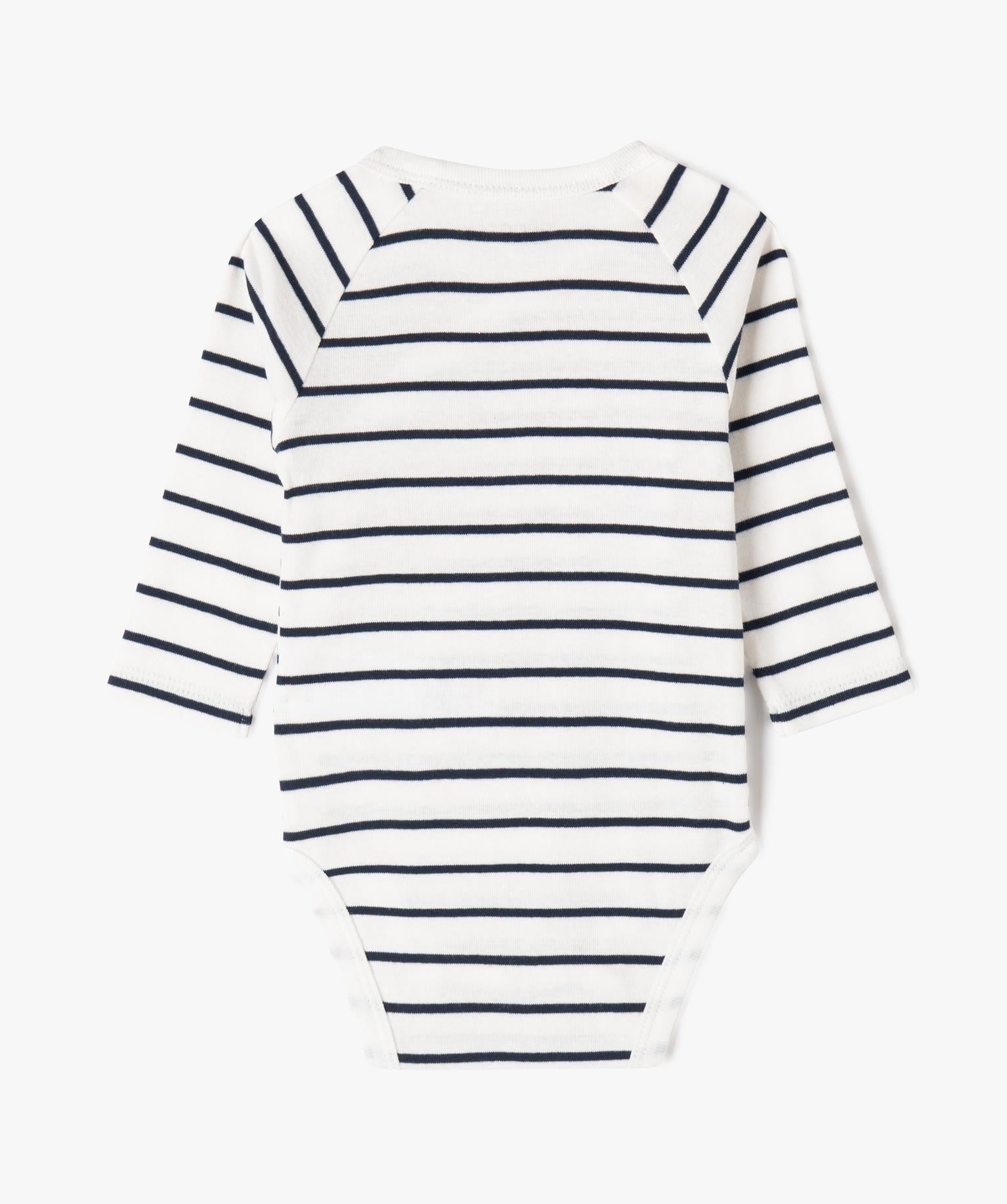 Parce qu’on n’a jamais assez de bodies pour habiller bébé pendant les premiers mois, Gémo présente ce lot de 3 bodies à manches longues. Des sous-vêtements particulièrement doux, confectionnés en coton biologique, et dotés d’une fermeture croisée avec boutons pression, facilitant l'habillage pendant les premiers mois de bébé. Ce lot de bodies bébé garçon à fermeture croisée se compose d’un modèle uni, d’un body rayé façon marinière et d’un modèle avec inscription sur la poitrine. Emmanchures raglan. Entrejambe pressionné.
