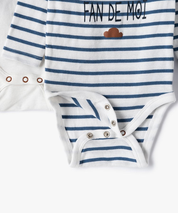 Ce lot de sous-vêtements bébé trouvera sa place dans le dressing de votre enfant. Un lot de bodies bébé garçon qui surfe sur la tendance éco-responsable avec sa composition 100% coton biologique et ses charmants motifs sur le buste. Des bodies à manches longues qui enveloppent bébé de douceur et lui assurent un maximum de confort sous tous ses vêtements. Des bodies avec encolure américaine et pressions à l’entrejambe pour faciliter l’habillage et le change. Ce lot se compose d’un modèle rayé, et de deux avec inscription et motif sur l’avant.