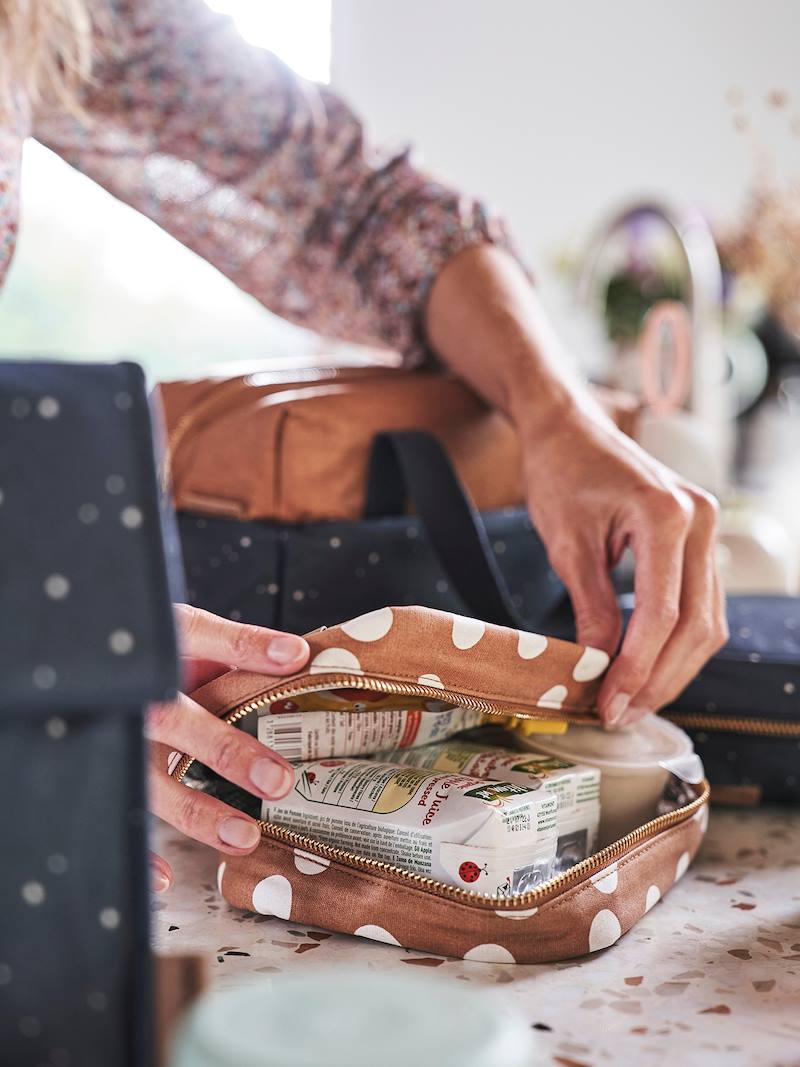Idéale pour y placer les petits goûters, cette snack box est en coton enduit imprimé, facile à nettoyer.
