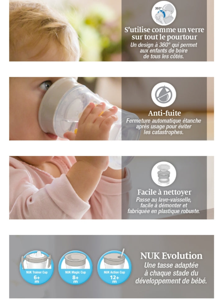 Apprendre à boire de façon autonome est l'une des étapes les plus importantes du développement d'un bébé et représente un véritable défi de patience et d‘habileté. C'est pourquoi nous avons conçu les tasses NUK Evolution – des tasses disponibles en deux tailles et avec différents accessoires qui évoluent avec l'enfant. Grâce aux nombreuses combinaisons possibles, cette gamme de tasses propose la bonne tasse pour chaque stade de développement.